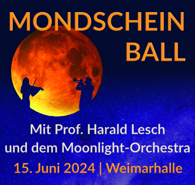 Anlässlich ihres 25jährigen Jubiläums lädt die Thüringer Tanz-Akademie mit ihrem Theater im Gewölbe zum Mondschein-Ball in den Festsaal der Weimarhalle. Prof. Harald Lesch und Hans Raths eröffnen den Abend mit einer universellen Betrachtung von außerirdischen Besuchern auf tanzenden Planeten. Ob "Moon River", "Fly me to the Moon" oder "Hijo de la luna" – das Moonlight Orchestra führt in mitreißenden Ballrunden thematisch durch die Nacht, Gesang und Moderation Eva-Maria Ortmann und Patrick Rohbeck. Umrahmt wird dieses himmlische Vergnügen neben Schautänzen und Shows der Akademie von akrobatischer Luft- und Tanzartistik des Circus Gaudimus.